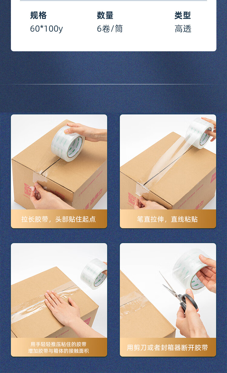 得力(deli)高品質(zhì)高透明封箱膠帶倉庫打包膠帶 60mm*100y*50um(91.4m/卷) 6卷/筒 辦公用品 30325